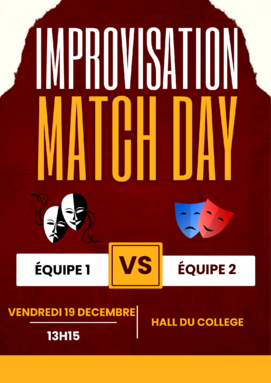 Par STEPHANIE CIMBAULT, publié le mercredi 10 décembre 2025 18:43 - Mis à jour le mercredi 10 décembre 2025 18:43A 13h15, vendredi 19 décembre, tous les élèves sont conviés à assister à un match d'improvisation entre les acteurs des "jeudis qui changent", et à voter pour la meilleure prestation !! -